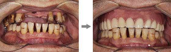 李大爷由于没有保护好牙齿,再加上长期有抽烟的习惯,导致牙齿逐渐松动脱落,由于多颗牙缺失影响饮食后李大爷无奈戴上了活动假牙,然而假牙并没有解决李大爷的问题,很多东西不能咬,此外几年后李大爷仍有几颗牙相继下岗,最终导致半口牙全军覆没。